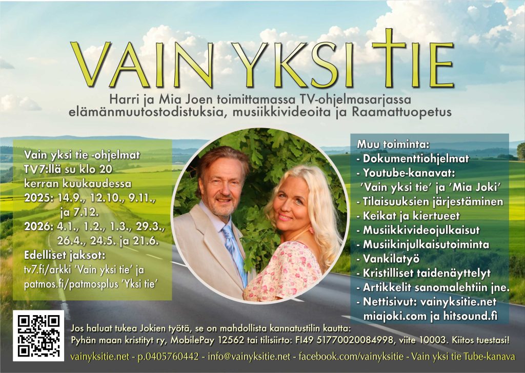 Vain yksi tie -ohjelmissa nähdään ja kuullaan mielenkiintoinen ’elämänmuutostodistus’ vierailijoilta, joita ovat entiset vangit, lähetystyöntekijät ja muut mielenkiintoiset persoonat. Ohjelmaa tuottaa evankelista/muusikko-pariskunta Mia ja Harri Joki. Mia on laulaja ja lauluntekijä, joka esiintyy musiikkivideoilla. Sananpaikan käyttää Harri. Tervetuloa seuraamme!