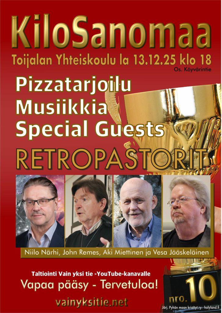 Kymmenenteen KiloSanomaa -tapahtumaan 13.12.25 saapuu Retropastorit: Niilo Närhi, John Remes, Aki Miettinen ja Vesa Jääskeläinen. Luvassa iloista, koskettavaa ja jouluista tunnelmaa. Lopuksi oli pizza- ja salaattitarjoilu.
